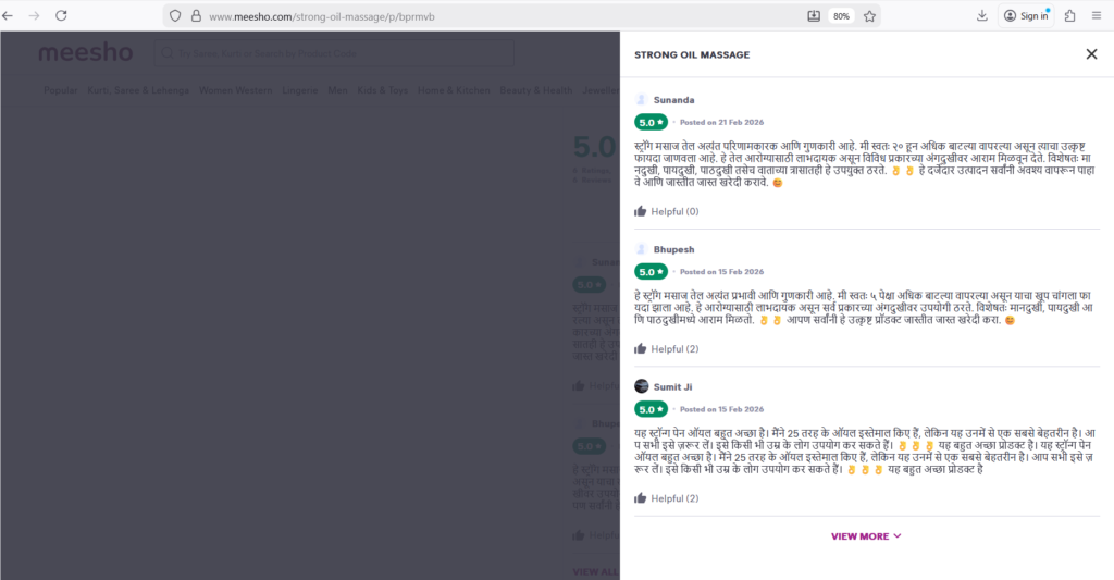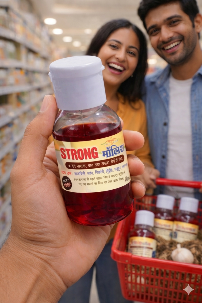 I have been using Strong Massage Oil for a few weeks now, and I am extremely satisfied with the results. It provides quick relief from muscle pain, joint stiffness, and body aches. The blend of natural ingredients like garlic, clove, cinnamon, and other Ayurvedic herbs gives a soothing warming effect that relaxes the muscles almost instantly.The oil absorbs well into the skin without feeling too sticky, and the herbal aroma feels very natural and calming. It is especially helpful after long working hours or physical activity. I also noticed improvement in stiffness and discomfort in my back and knees.The packaging is convenient and easy to use. Overall, this is a powerful and trustworthy massage oil for anyone looking for natural pain relief.