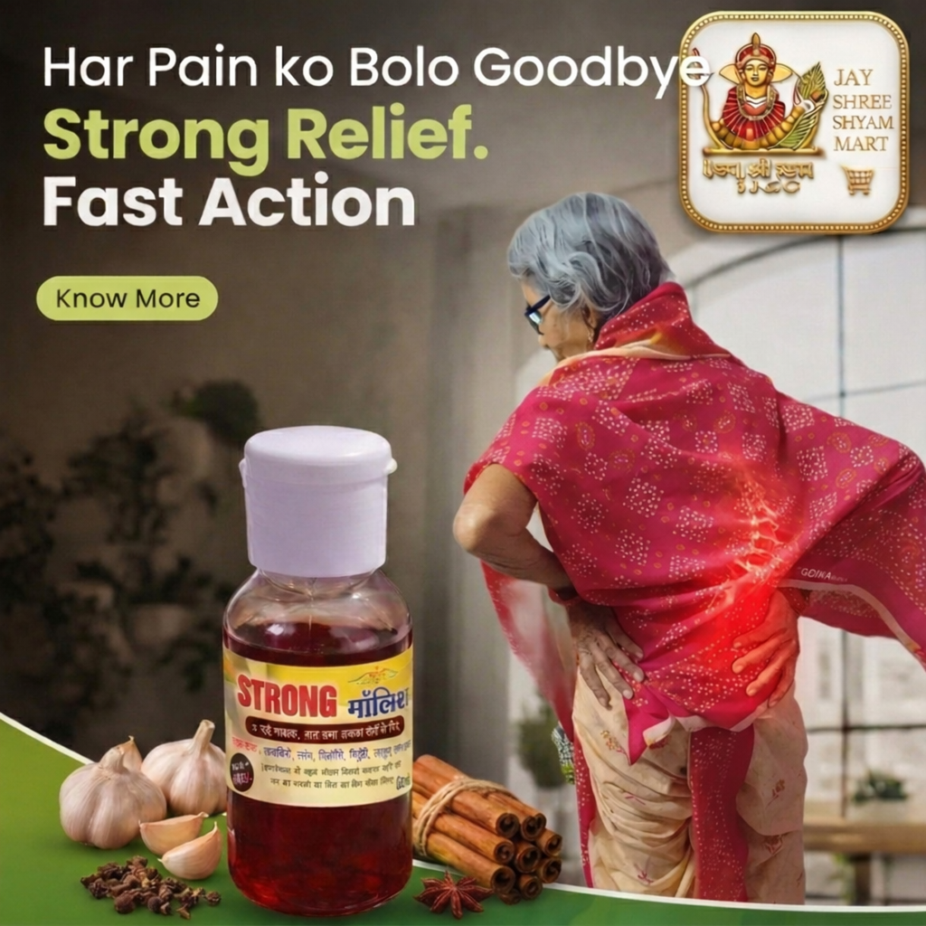 I have been using Strong Massage Oil for a few weeks now, and I am extremely satisfied with the results. It provides quick relief from muscle pain, joint stiffness, and body aches. The blend of natural ingredients like garlic, clove, cinnamon, and other Ayurvedic herbs gives a soothing warming effect that relaxes the muscles almost instantly.The oil absorbs well into the skin without feeling too sticky, and the herbal aroma feels very natural and calming. It is especially helpful after long working hours or physical activity. I also noticed improvement in stiffness and discomfort in my back and knees.The packaging is convenient and easy to use. Overall, this is a powerful and trustworthy massage oil for anyone looking for natural pain relief.
